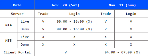 As a result, we will keep the maintenance according to the following schedule and will reopen for trading at 00:00 (GMT+2, system time) on Monday, November 22, 2021.