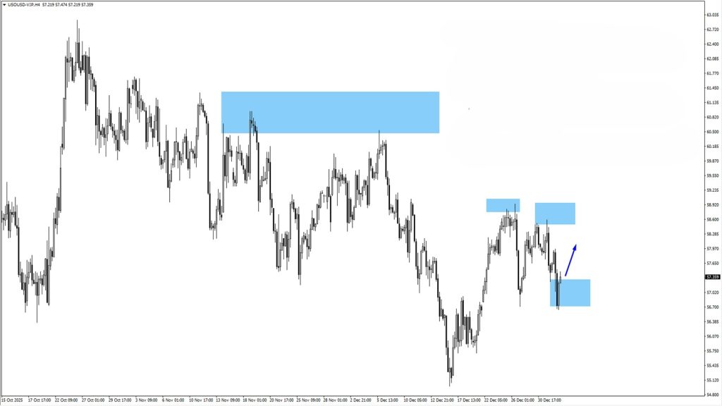 • Après avoir franchi la zone de résistance surveillée de 58,50, le pétrole américain a absorbé la liquidité à 56,716 avant de rebondir plus haut.