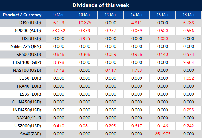 Please note that the dividends of the following products will be adjusted accordingly. Index dividends will be executed separately through a balance statement directly to your trading account, and the comment will be in the following format “Div & Product Name & Net Volume ”.