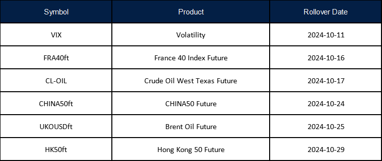 • Positions that are open on the expiration date will be adjusted via a rollover charge or credit to reflect the price difference between the expiring and new contracts.