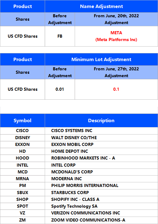 2. From June 20, the name of the US stock CFD product FB will be adjusted to META, and the full name will be adjusted to Meta Platforms Inc.