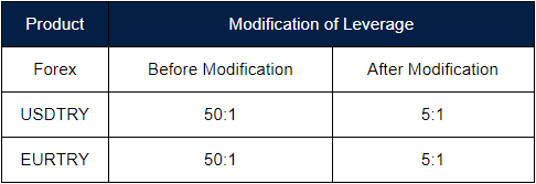 1.TRY Crosses products leverage will be modified from 50:1 to 5:1